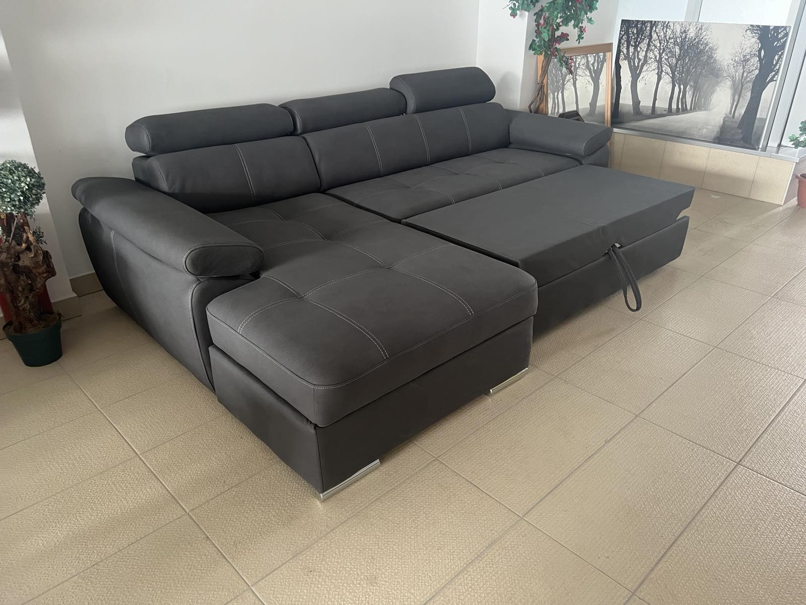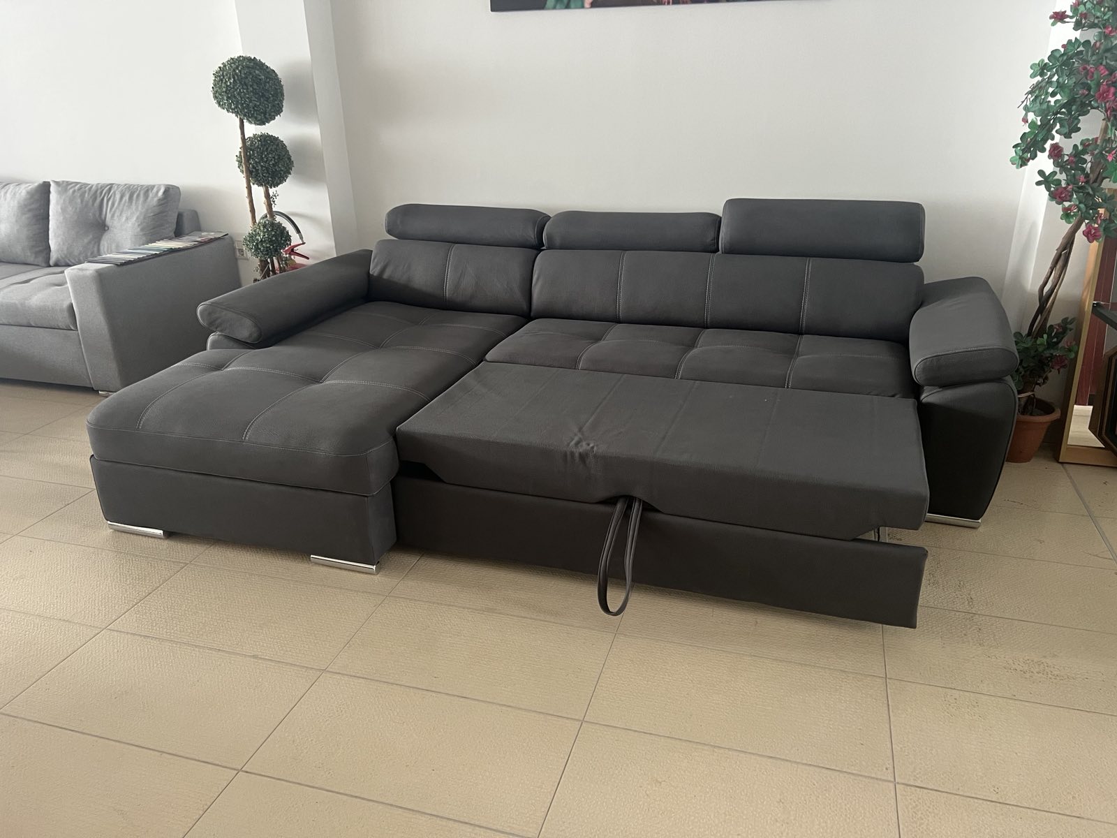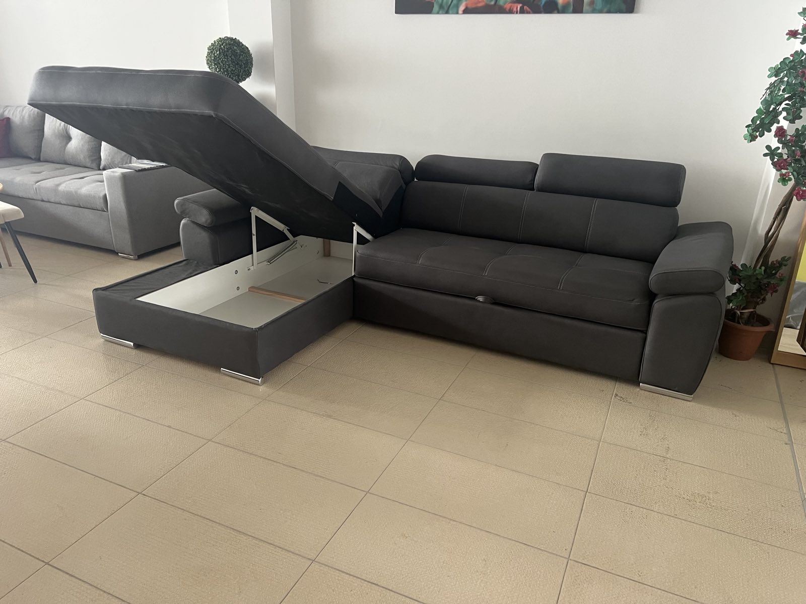 Ugaona garnitura “CASTELANO” sa mehanizmom za razvlačenje čime nudi mogućnost pretvaranja u spavaći ležaj za dvije osobe. Dimenzije je 275 sa 175 cm. Takođe posjeduje prostor za odlaganje ispod dijela dvosjeda. Dostupna u više dezena i materijala.